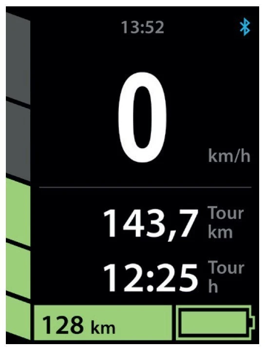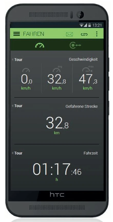 - zusätzlich kann das Smartphone als zweites Anzeigengerät benutzt werden, wenn es am Lenker befestigt wird. Somit lassen sich Tageskilometer, Durchschnittsgeschwindigkeit etc. anzeigen