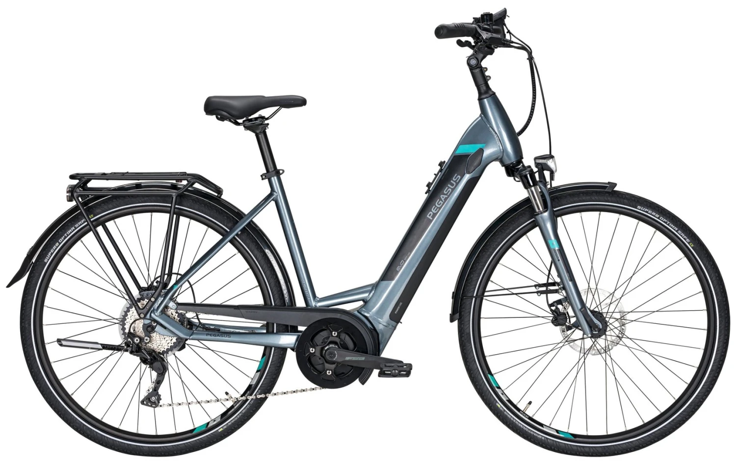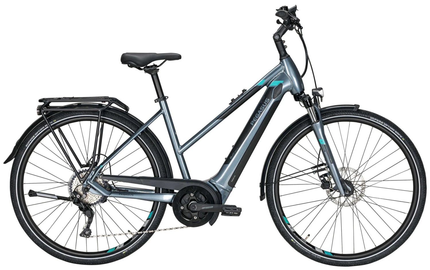 Hydroforming 6061 Alu-Rahmen mit tapered Steuerrohr, NEX-E25-DS Federgabel, Deore 10-Gang Schaltwerk, Schalthebel und Zahnkranz (11-42), Tektro HD-T275 Scheibenbremsen mit 180/160mm Bremsscheiben, Taurus-2000 Hohlkammerfelgen, Bosch Performance Mittelmotor 250W/65Nm, integrierter 400Wh (Serie), 500Wh oder 625Wh (Aufpreis) Akku 36V Li-Ion, Supero Optima Safe Reifen 47-622, Fuxon FS-70 LED-Lampe mit 70 Lux, 12 Volt Lichtanlage, Comodoro Sattel, verstellbarer UP-Vorbau