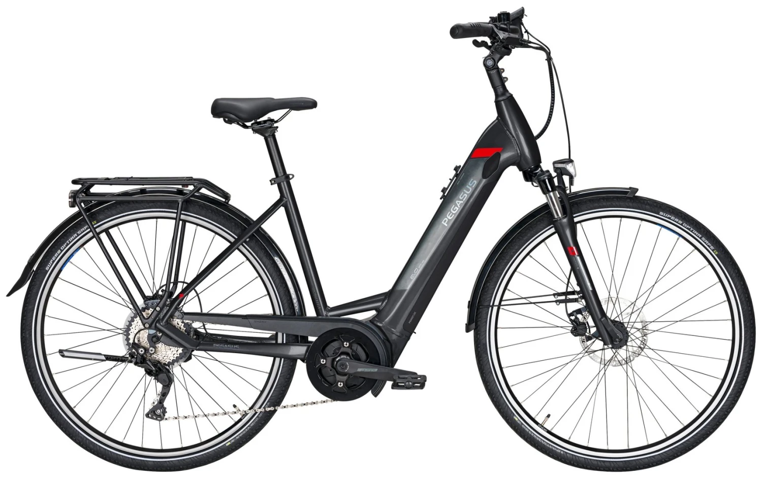 Beim Premio EVO 10 stehen Fahrkomfort und harmonische Formgebung im Mittelpunkt. Als vielseitiges Trekkingbike konzipiert, vereint es den angenehmen Charakter eines nachdrücklich anschiebenden Bosch-Motors mit dem hohen Komfort einer aufrechten Sitzposition, ergänzt durch die Stoßabsorption einer weich ansprechenden Federgabel. Der in drei Varianten verfügbare Rahmen ist dank innenliegendem Akku besonders glattflächig; eng ans hintere Schutzblech geschmiegt ist der solide Gepäckträger mit seinen schräg abfallenden Seitenteilen. Danke der gut erreichbaren Ladebuchse am Unterrohr lässt sich der mit 400, 500 oder 625 Wattstunden verfügbare Akku einfach mit Strom versorgen. Zum großen Übersetzungsumfang der 10-Gang-Kettenschaltung kommen kräftige Scheibenbremsen; rutschfeste Pedale und eine helle Lichtanlage bieten zusätzliche Sicherheit.