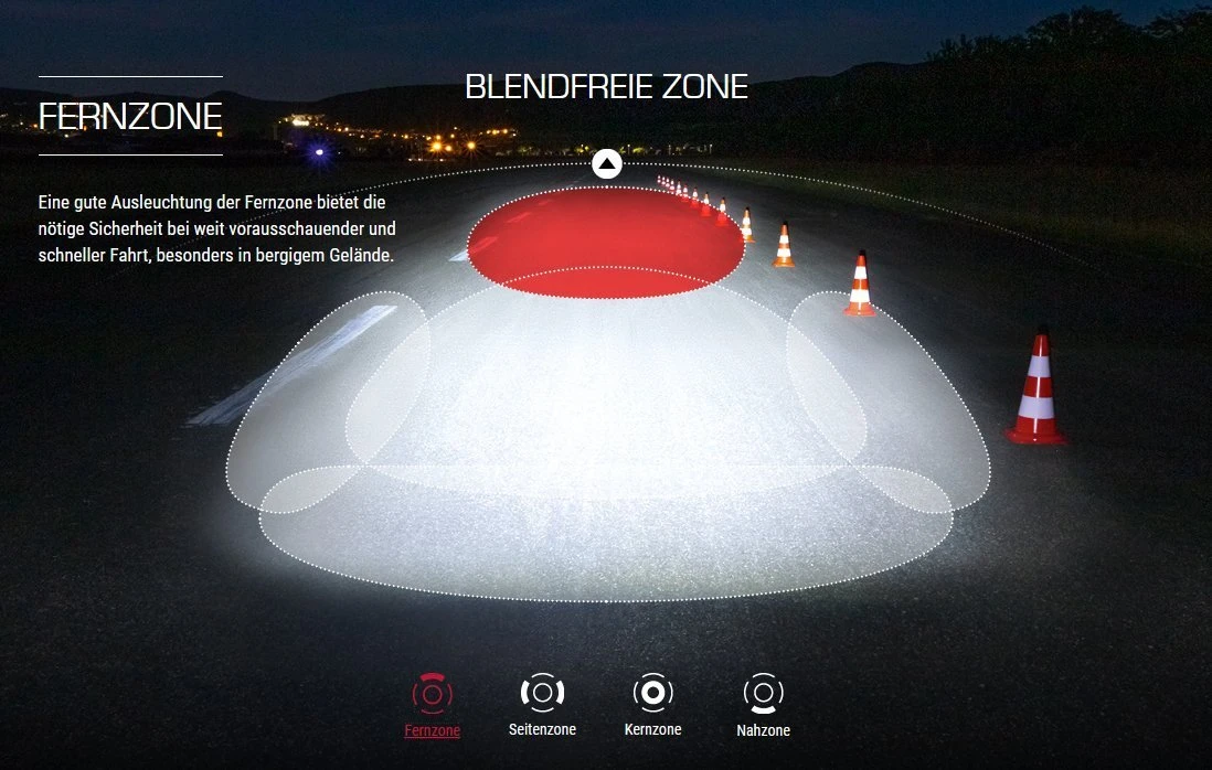 Mit einem homogenen Lichtbild bietet die AURA 80 USB optimale Sicht im Fern-, Seiten-, Kern- und Nahbereich, ohne dabei andere Verkehrsteilnehmer zu blenden. Damit gewährleistet sie höchste Sicherheit im Straßenverkehr.